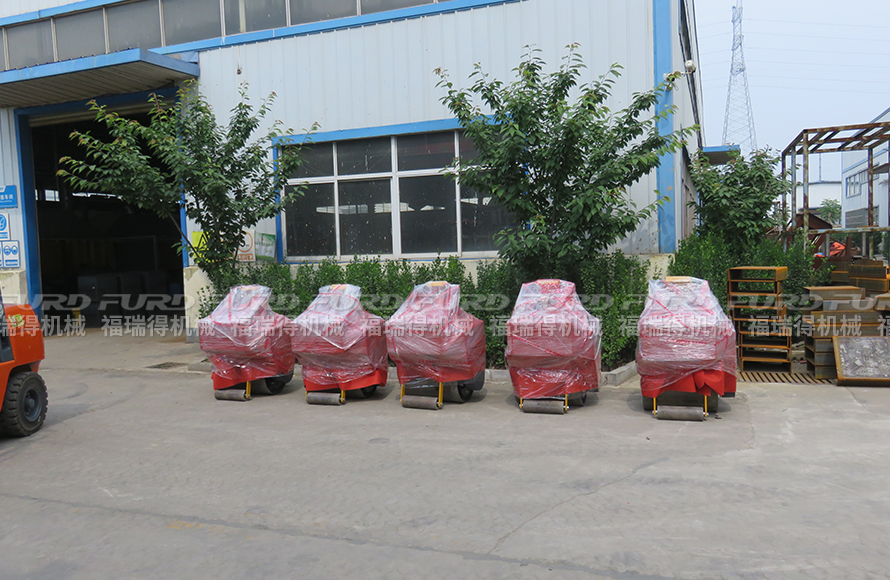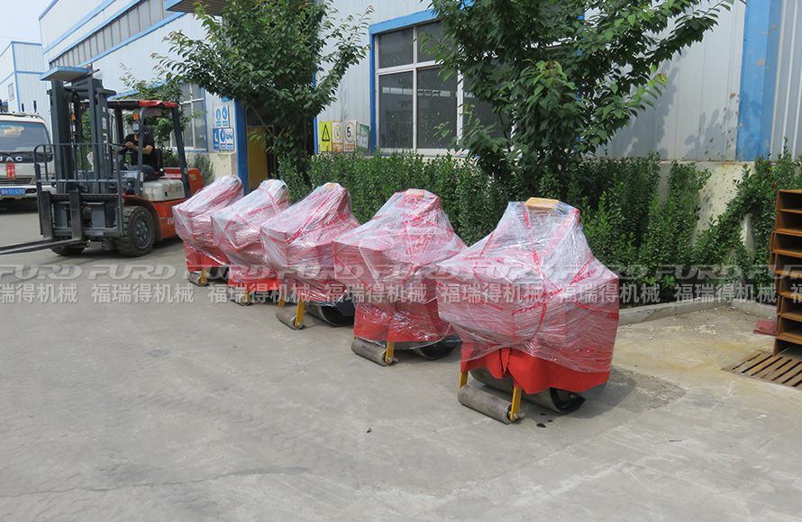 福瑞得5臺(tái)手扶單鋼輪壓路機(jī)打包裝車發(fā)往寧波
