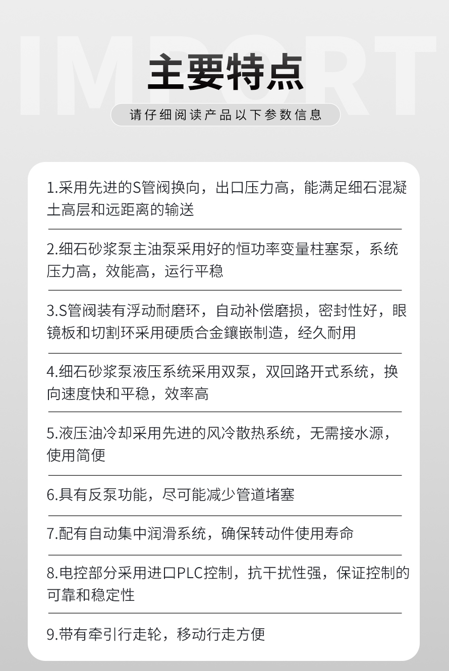 25型二次構(gòu)造柱專用輸送泵是一種復(fù)合泵送要求的混凝土泵,通過(guò)水平或垂直安裝的管道,連續(xù)輸送到澆注現(xiàn)場(chǎng)的細(xì)石混凝土輸送設(shè)備。 廣泛應(yīng)用于二次構(gòu)造柱填充、地暖工程、屋面、高層建筑的墻、水庫(kù)、水電站、港口、碼頭、基礎(chǔ)處理 軟弱地基 加固注漿 隧